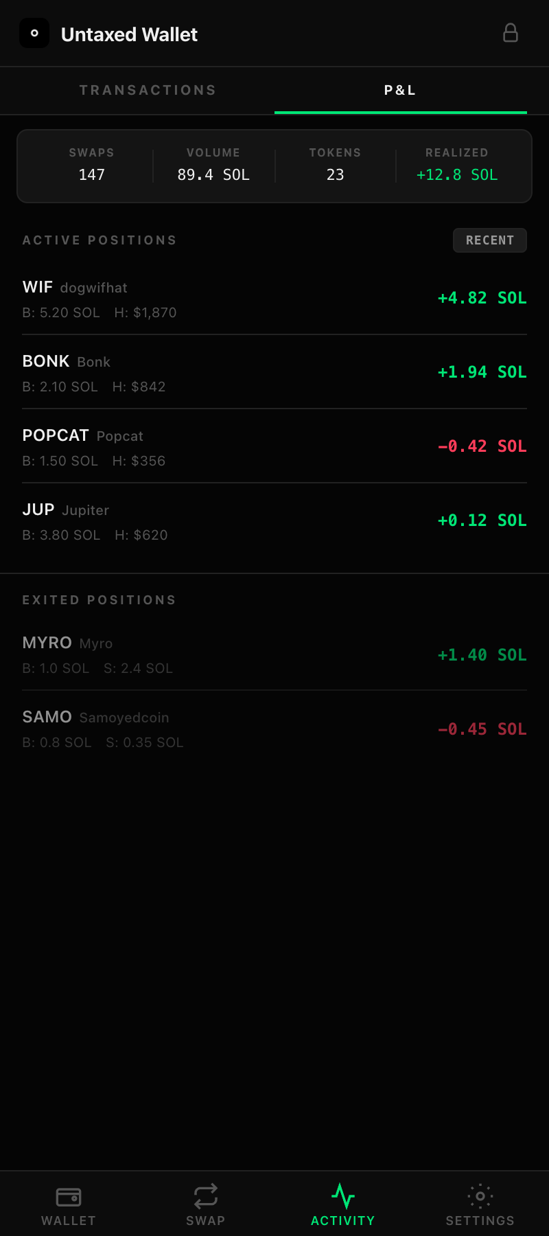 On-chain synced P&L for every position. Track active and exited trades, unrealized gains, and wallet stats.