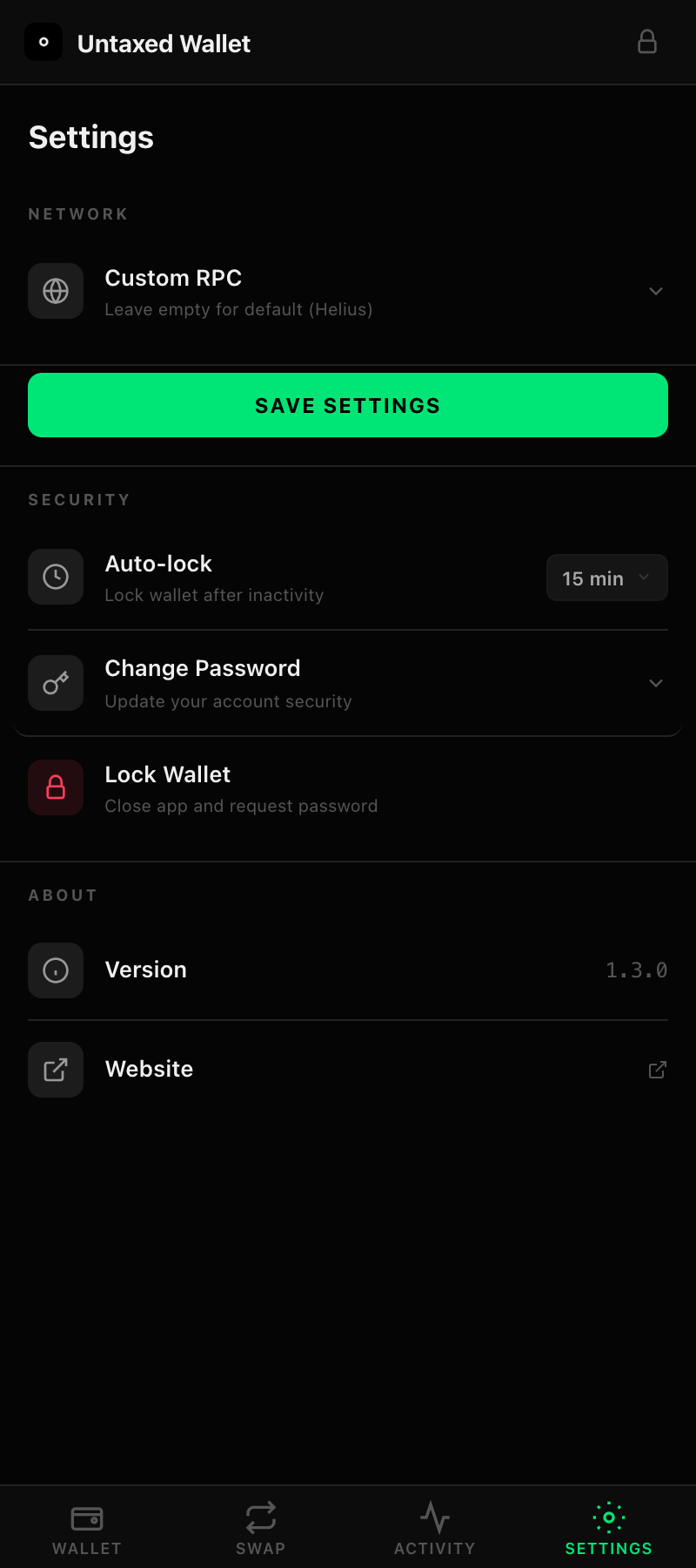 Configure buy presets, slippage, priority fees, Jito tips, auto-lock timers, and custom RPC endpoints — your way.