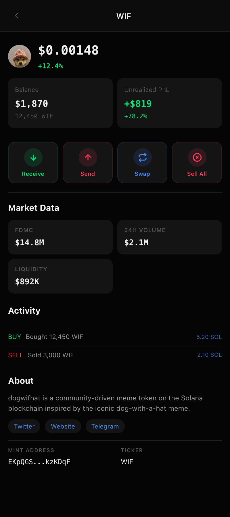 One-tap preset buttons to buy with custom SOL amounts or sell at 25%, 50%, 100%. No forms, no friction — just speed.